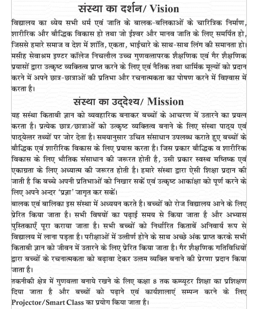 At Masih Sevashram Inter College, students are provided with a well-rounded education that emphasizes not only intellectual development but also the cultivation of values and ethics. The serene environment of Nichlaul offers an ideal setting for learning, allowing students to focus on their studies and personal growth in a peaceful and supportive atmosphere.